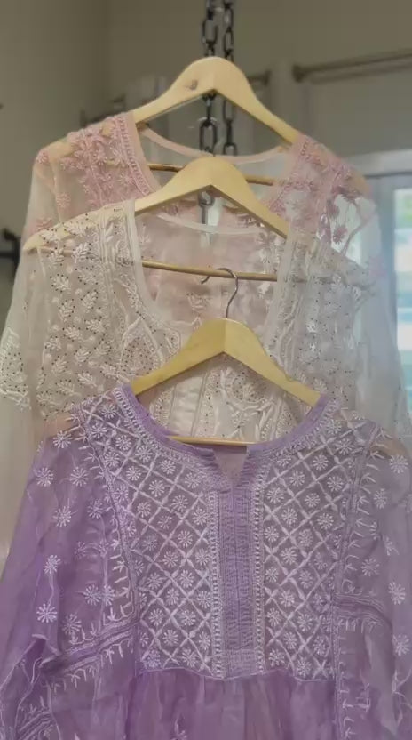 A soft Chikankari organza long kurti featuring delicate hand embroidery and a graceful flowing silhouette — perfect for festive gatherings and elegant day occasions.